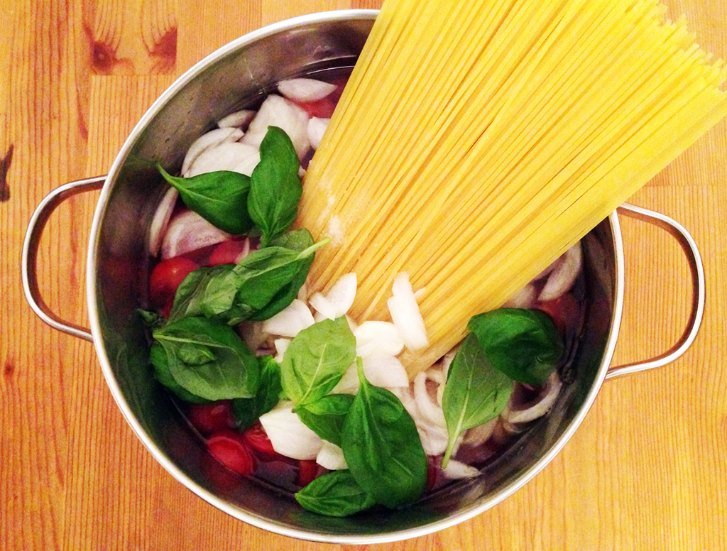 Es geht schnell und ist superlecker: Die „One Pot Pasta“. Nix mit Nudeln vorkochen oder Zwiebeln andünsten. Alle Zutaten kommen auf einmal in einen Topf, werden gemeinsam aufgekocht und anschließend serviert. Genau das Richtige, wenn’s schnell, einfach und mit wenig Abwasch sein soll – aber trotzdem lecker, frisch und gesund. Im Gegensatz zur getrennten Zubereitung von Nudeln und Soße, garen die Nudeln direkt in der herrlich duftenden Soße und nehmen den tollen Geschmack an. Gehört ab sofort zu meinen Lieblingsrezepten.